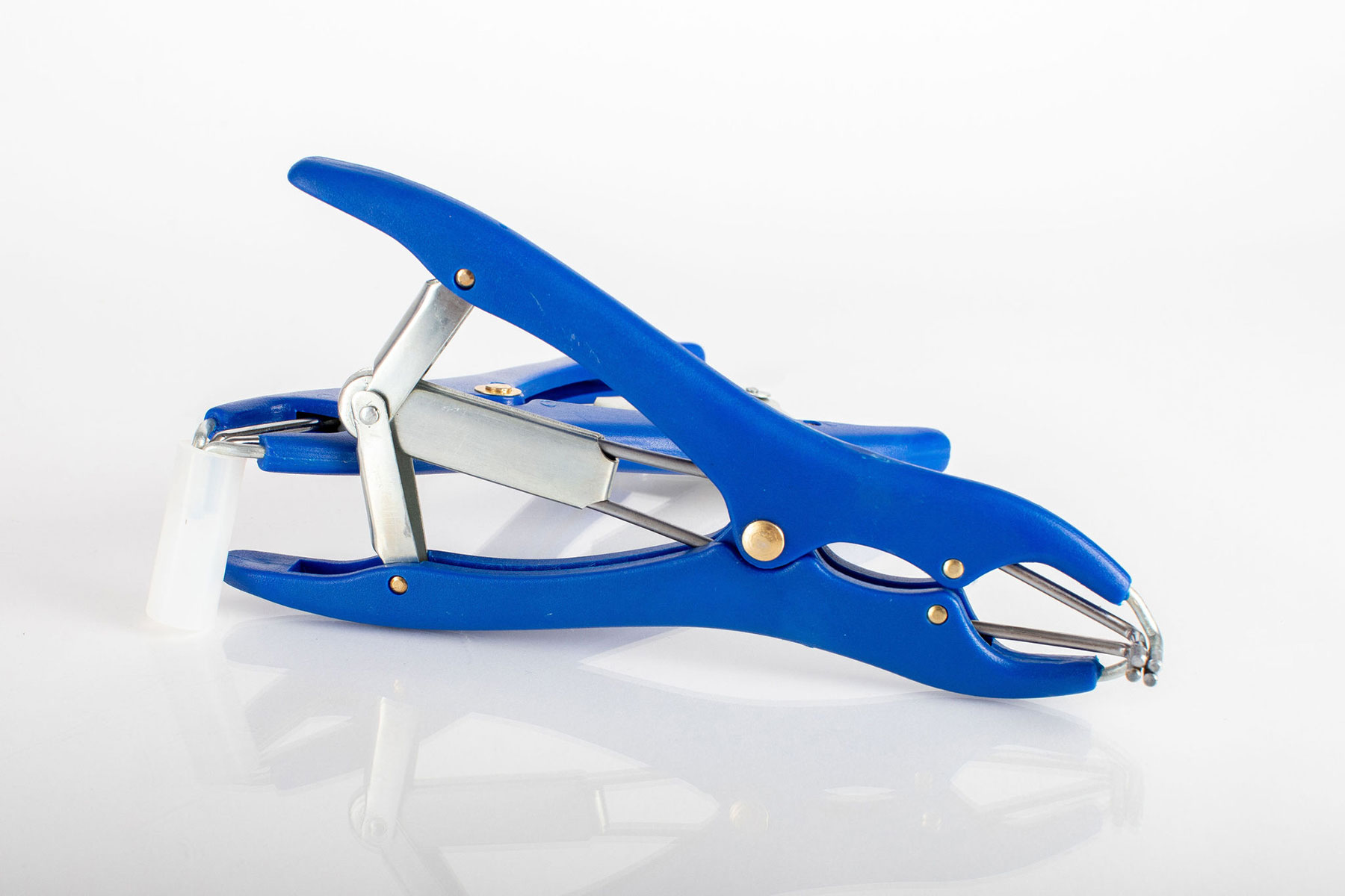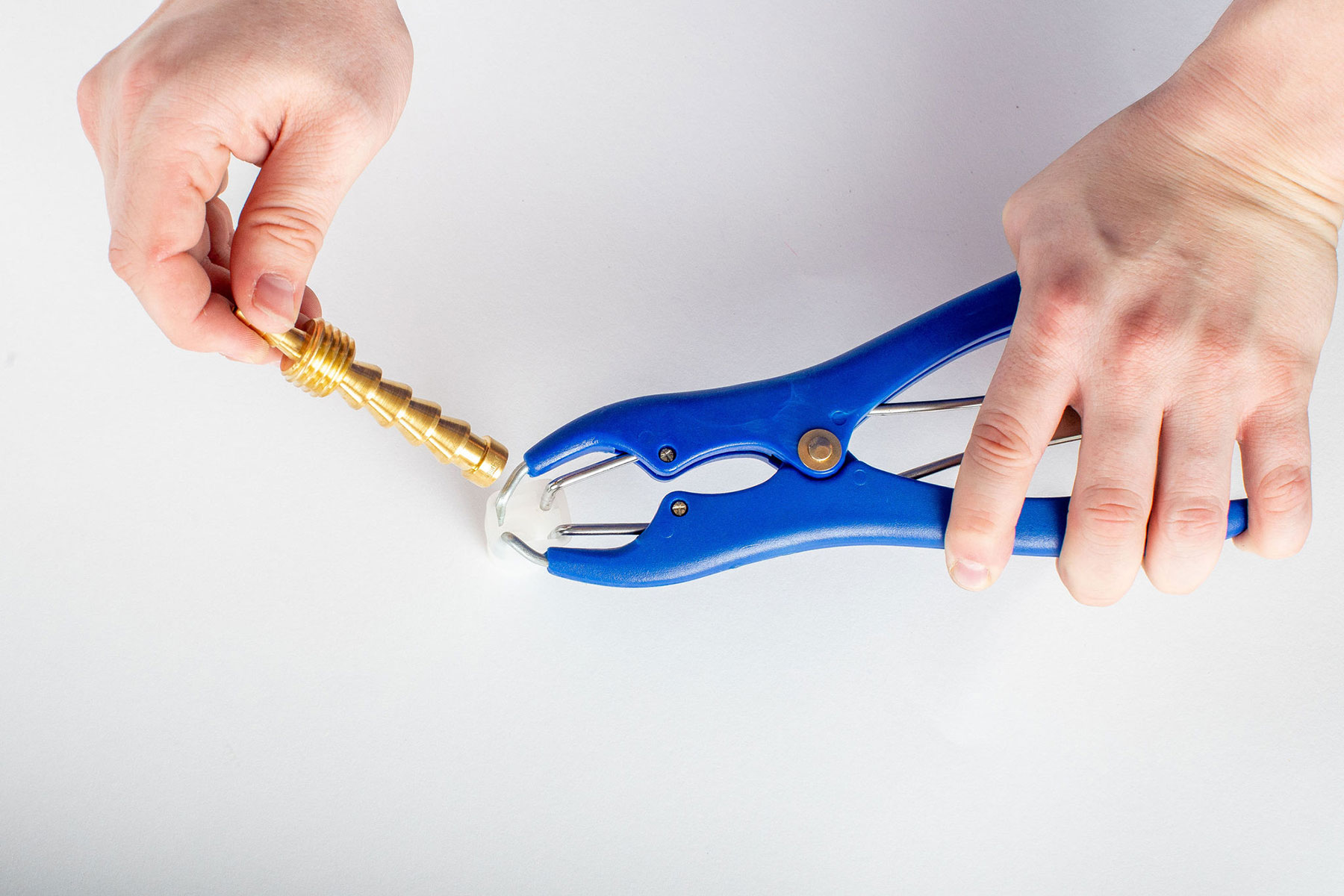 Thread the Vapor Pin® sampling device into a secure cover or the installation/extraction tool. Insert the Prongs of the Elastrator into the sleeve. Squeeze the Elastrator to open, and push the Vapor Pin® sampling device into the sleeve.